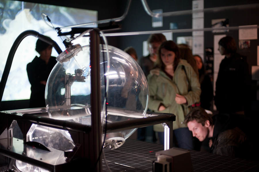 Im Zentrum ihrer Ausstellung in GLASMOOG steht das „Troposphaerenlabor“, eine auf die Produktion und Erforschung von Wolkenkernen gerichtete Installation. Das „Troposphaerenlabor“ bildet das gravimetrische Dokument des Experiments „Wolken-Kern-Scanner“, das Meyer-Brandis in temporärer Schwerelosigkeit an Bord eines Forschungsflugzeuges des Deutschen Zentrums für Luft und Raumfahrt durchführte. Es zeigt eine zwischen geordneten und entfesselten Zuständen oszillierende Welt. Teil des „Wolken-Kern-Scanner“-Projekts ist das Video „Fluid Matter“, das die verschiedenen Stufen der Schwerelosigkeit während des Forschungsfluges dokumentiert. Eine Kontext-Wand bringt verschiedenen Experimente und Projekte in einem Bezugssystem zusammen und eröffnet den Blick auf historische Hintergründe, Forschungsdokumente, Fotografien, Zeichnungen, Risikoanalysen.