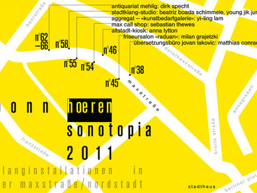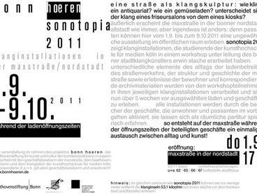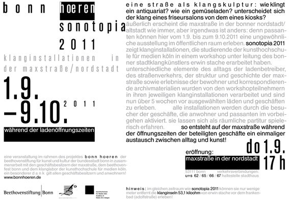 Eine Strasse als Klangskulptur! Wie klingt ein Antiquariat? Wie ein Gemüseladen? Unterscheidet sich der Klang eines Friseursalons von dem eines Kiosks? Äußerlich erscheint die Maxstraße in der Bonner Nordstadt/Altstadt wie immer, aber irgendetwas ist anders: denn Passant_innen können hier vom 1.9. bis zum 9.10.2011 eine ungewöhnliche Ausstellung im öffentlichen Raum erleben. sonotopia 2011 zeigt Klanginstallationen, die Studierende der Kunsthochschule für Medien Köln unter der Leitung des Bonner Stadtklangkünstlers Erwin Stache erarbeitet haben. Unterschiedliche Elemente des Alltags der Ladenbetreiber, des Straßenverkehrs, der Struktur und Geschichte der Maxstraße sowie Erlebnisse der Bewohner und korrespondierende Archivmaterialien wurden von den Workshopteilnehmern in ihren jeweiligen Klanginstallationen verarbeitet und sind nun über 5 Wochen vor ausgewählten Läden und Geschäften zu erleben. Alle Installationen werden durch die Besucher_innen der Geschäfte, die Anwohner_innen und Passant_innen im Vorbeigehen aktiviert. Sie lassen sich als räumliche Partitur spielerisch erfahren. Auf der Maxstraße entsteht so ein einmaliger Austausch zwischen Alltag und Kunst!