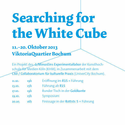 Die situative Ausstellung „Searching for the White Cube“ ergründet das Verhältnis von künstlerischer Produktion und Präsentation. Gemeinsamer Ausgangspunkt der künstlerischen Arbeiten sind der Überfluss von Raum in einer durch Leerstand geprägten Stadt wie Bochum, die einseitige Ausrichtung der kulturpolitischen Unterstützung und die Dekonstruktion der gängigen Ausstellungspraxis. Im innerstädtischen Raum werden 12 künstlerische Positionen die unterschiedlichen Kontexte der Stadt Bochum und ihrer Entwicklung, der nahräumlichen Umgebung, des Leerstands, der Nachbarschaft, der Infrastruktur, der Historie thematisieren. Die Künster_innen gehen hierbei auf unterschiedlichste Weise in ihren Arbeiten spezifisch auf die Orte und ihre Zusammenhänge ein.