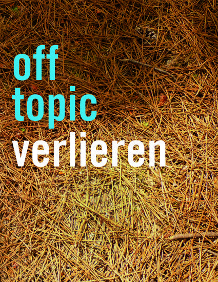 "off topic" ist eine Zeitschrift für mediale Künste, in der die Vielfalt aktueller Kunstformen in Praxis und Theorie zum Ausdruck kommt. Verbindungen und Zusammenhänge entstehen mit jedem Heft aufs Neue in der Auseinandersetzung mit einem gemeinsamen Thema. Die bisherigen Ausgaben #0 bis #4 beschäftigten sich mit "übersetzen", "aufräumen", "beschweren", "unterbrechen/wiederholen" und zulassen.
