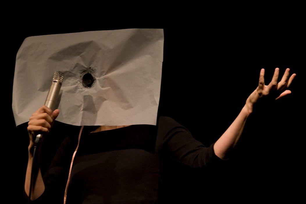 Song No 3 is a performance during which I use arm gestures, normally used by singers as a by-product of their singing performance, as a means to control electronic sound. Within traditional performance practice, a singer’s movements are incidental to the production of sound. They are related to making sound but not perceived as its main cause: a singer may be able to sing without any arm movements (although it will probably sound different), but definitely not without breathing and pushing the air through the vocal chords. To render my arm and head movements audible, I decided to use a loudspeaker in front of my mouth to diffuse the sound during the performance. I am not singing at all during the performance. All sounds are generated by the computer software and emitted through the loudspeaker. A large piece of white paper was glued onto the loudspeaker to obscure my face. To make the sound interact with the movements of my arm, I used a microphone, exactly as singers do. The distance between the microphone and loudspeaker can be manipulated to produce different sound shaping processes.