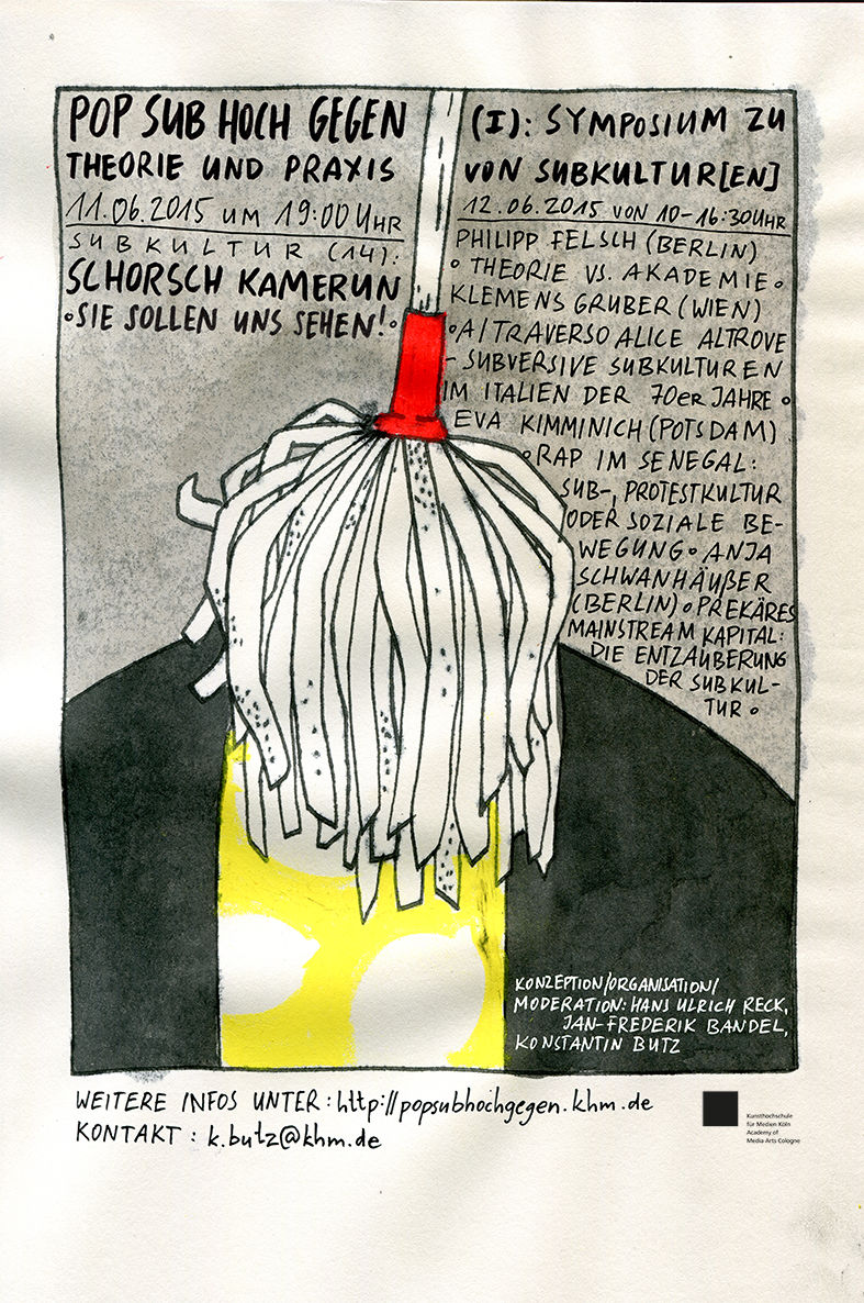 Das Symposium POP SUB HOCH GEGEN fragt nach den empirischen Dimensionen von Subkultur(en) und lädt dazu fünf verschiedene Gäste aus den unterschiedlichsten Bereichen und Disziplinen ein. Konzeption/Organisation/Moderation: Prof. Dr. Hans Ulrich Reck, Dr. Jan-Frederik Bandel, Dr. Konstantin Butz.
