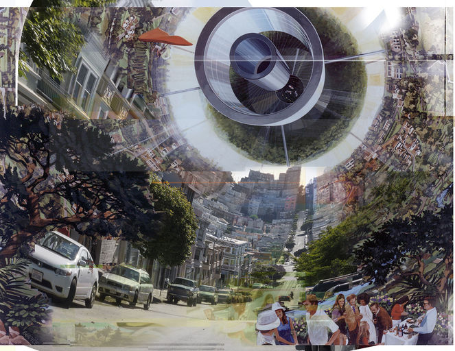 „San Francisco Space Colony“, Digitale Collage beruhend auf einer 1975 NASA-Illustration von Rick Guidice. Ralo Mayer, 2013