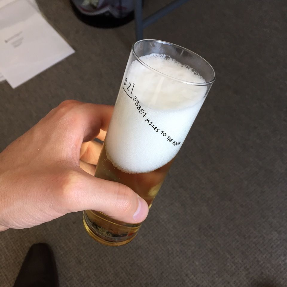 Anna Baydak setzt in ihrem Entwurf die mittlere Entfernung zwischen Erde und Mond mit dem Fassungsvermögen einer traditionellen Kölsch-Stange in Bezug. Baydak stellt lakonisch die Frage, ob die mittlere Distanz zum Mond 238 857 Meilen oder doch gerade mal nur 0,238857 Liter beträgt. Die ungeachtet der erfolgten Mondlandung nach wie vor mythische Vorstellung einer Reise zum Mond lässt sich hier in der eigenen Imagination des Glas-Austrinkens absolvieren.
