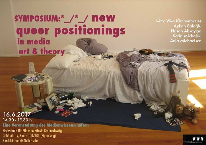 Vika Kirchenbauer, Aykan Safoğlu, Hasan Aksaygın, Karin Michalski und Anja Michaelsen präsentieren Auszüge aus ihren aktuellen künstlerischen bzw. theoretischen Arbeiten zu queeren Themen. Was für Strategien des “Queerings” werden in aktueller (Medien-)Kunst bearbeitet oder aus ihr hervorgebracht? Gibt es ein neues Verständnis von Queerness in Kunst und wie sie (nicht) dargestellt werden sollte? (Wie) Hat sich queere Kunst in den letzten Jahrzehnten verändert? Die Präsentationen und Diskussionen behandeln Themen an den Schnittstellen von Queer Theory, Kunst- und Medienwissenschaften.