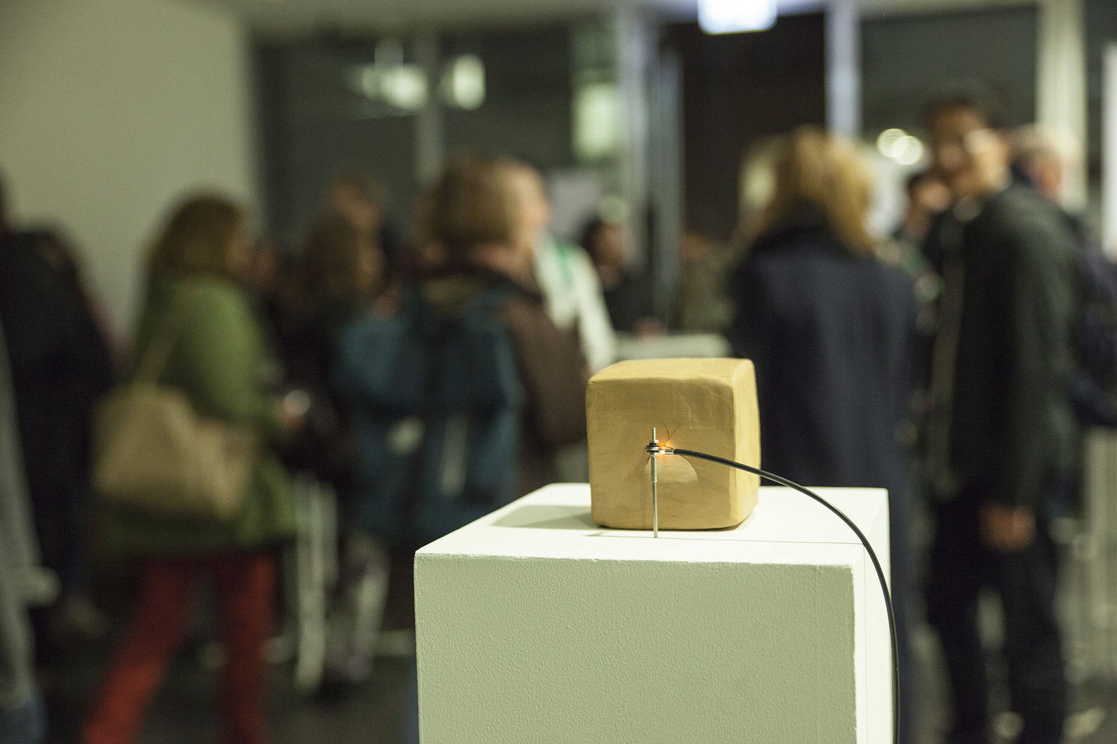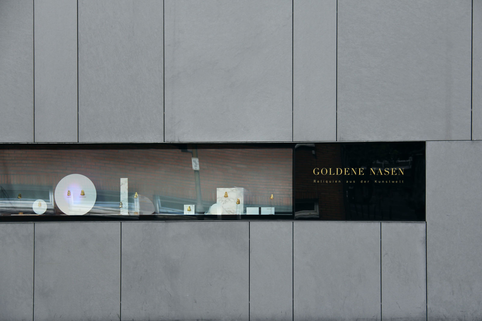 Qimeng Suns "Goldene Nasen Laden" (2017), der im vitrinenähnlichen Fenster der Aula zu sehen ist, nimmt die bekannte Redensart wörtlich und offeriert goldene Nasen erfolgreicher KünstlerInnen.