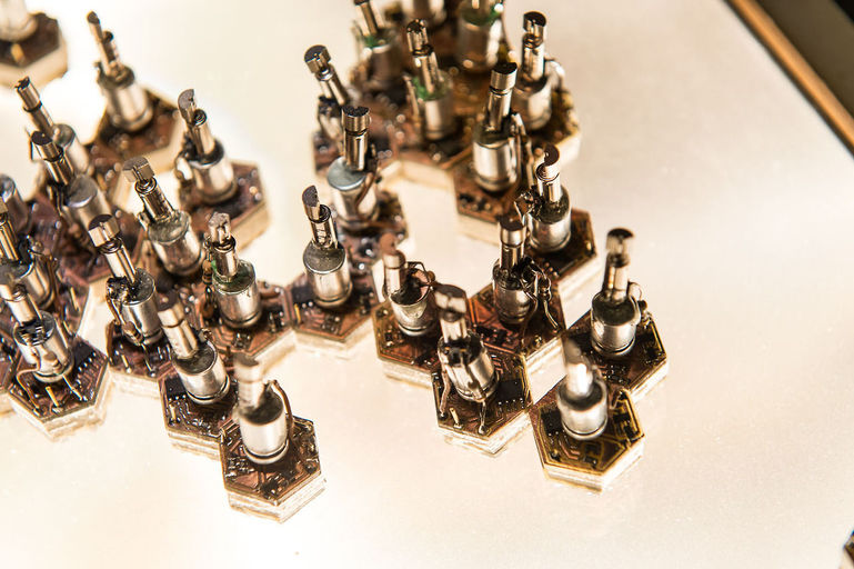 The crystal forming robots are a physical simulation of a growth process, similar to the growth of crystal structures. Each robot operates autonomously and is driven by the light of the overhead projector. When a robot has collected enough energy through its solar panel, the energy is all released at once through a small motor and the robot will make a random movement. The robots are equipped with tiny magnets, so that when they come close while they are moving, they attract each other and dock together. Over time a crystal-like structure emerges from more and more little robots forming larger clusters.