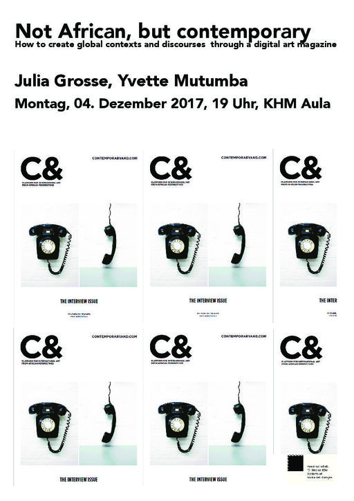 Mit dem Kunstmagazine Contermporary And (C&) – Platform for International Art from African Perspectives initiieren wir einen dynamischen Raum, in dem Ausgaben und Informationen über internationale Kunst aus Afrika und der Diaspora reflektiert und miteinander verbunden werden. In ihrem Vortrag werden Julia Grosse und Yvette Mutumba über ihre Arbeit bei C& sprechen sowie über Methoden, Definitionen und Herausforderungen ihres Engagements für die Sichtbarkeit und den Diskurs um zeitgenössische Kunst aus afrikanischen Perspektiven.