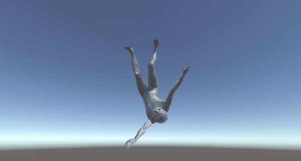 Das Game-Engine »Bodenlos« (2017) von Thomas Reul konfrontiert die Betrachter*innen mit dem freien und unaufhörlichen Fall eines 3D-Characters. Dadurch, dass man als Betrachter*in jedoch stets auf der gleichen Höhe mit dem fallenden 3D-Character befinden und fehlende Referenzpunkte keine Hinweise auf eine räumliche Bewegung liefern, stellt sich das Fallen lediglich in der Rotation des digitalen Characters dar.