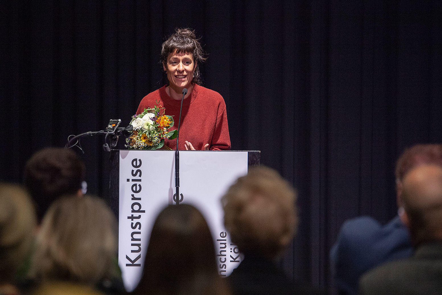 Zur Preisverleihung sprachen Christian Nagel (Vorsitzender der Freunde der KHM) und Prof. Dr. Hans Ulrich Reck (Rektor) sowie die beiden Laudator*innen Prof. Sophie Maintigneux (Professorin für Bildgestaltung) und Prof. Matthias Müller (Professor für experimentellen Film).