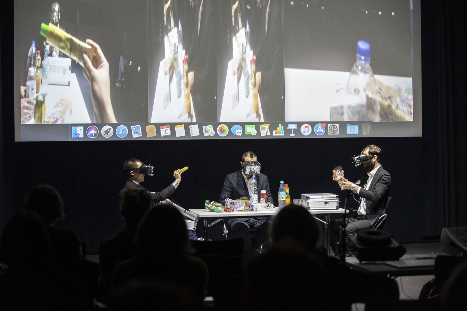 Das Trio aus Giorgi Gedevanidze, Phaidonas Gialis und Seongmin Yuk hat für seine Performance "Connected Reality” drei Brillen entwickelt, die den Perspektivwechsel erzwingen: A sieht, was B anschaut, B, das was C anschaut und C hat den Blickwinkel von A. Als ob das nicht schon verwirrend genug wäre, performen die Drei mit an ihren Körpern befestigten Mikrophonen und Lautsprechern eine experimentelle Choreographie der selbstauferlegten Unbeholfenheit, zu der Feedbackklänge zufälliger Konstellationen den Soundtrack abgeben.