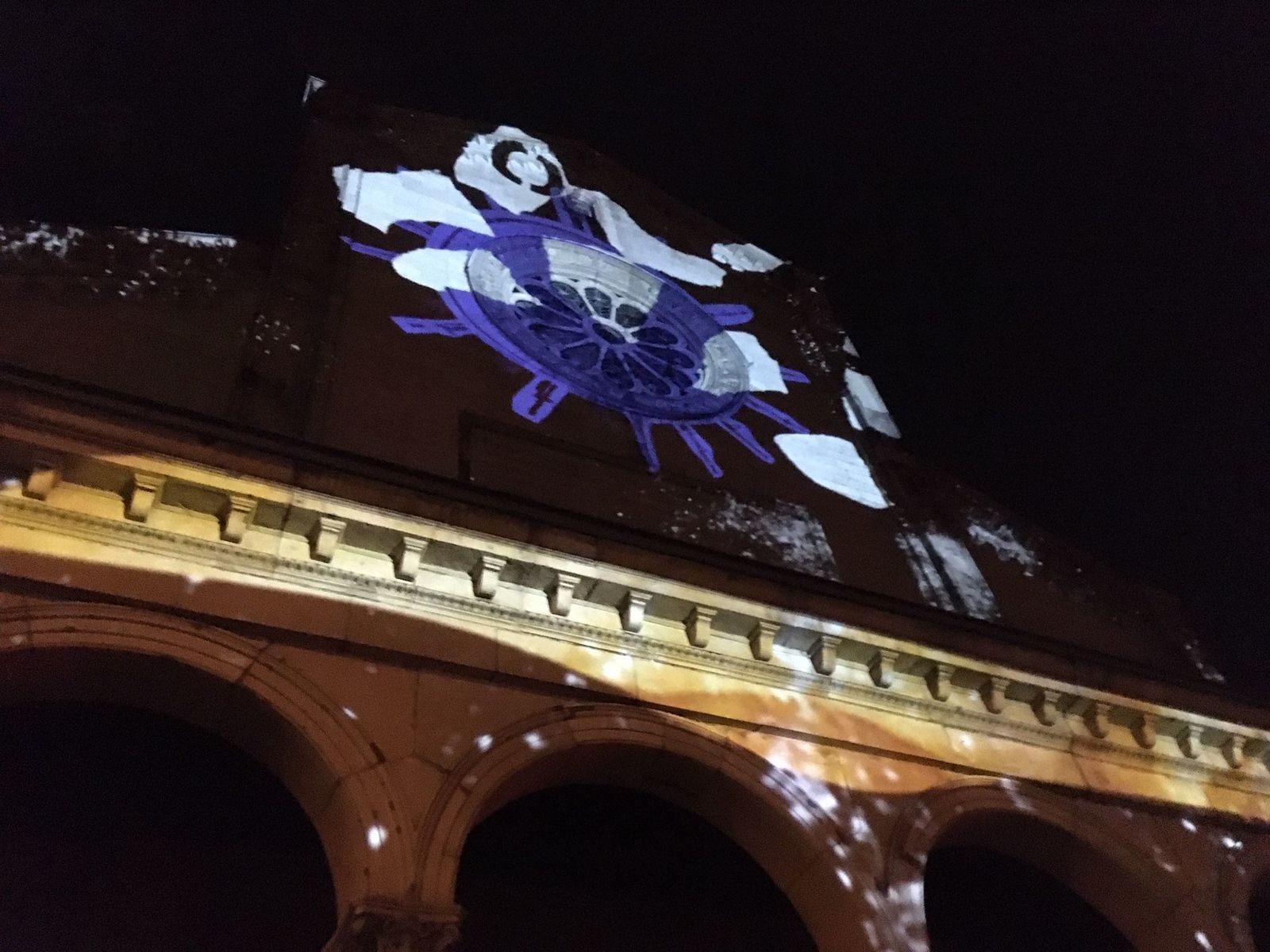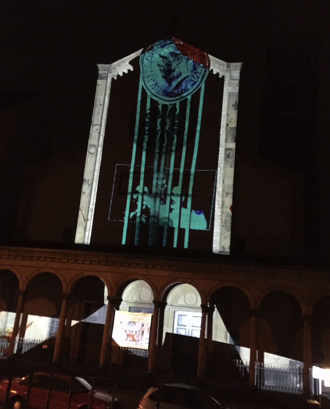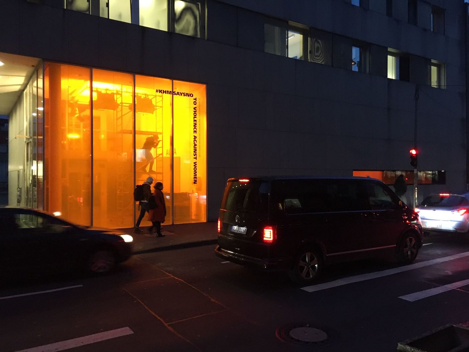 Die Gleichstellung der KHM und Studierende der KHM unterstützen wiederum die Aktion mit einem orange leuchtenden Aulafoyer am Filzengraben 2 und einem Videomapping auf die Trinitatiskirche am Filzengraben 6.