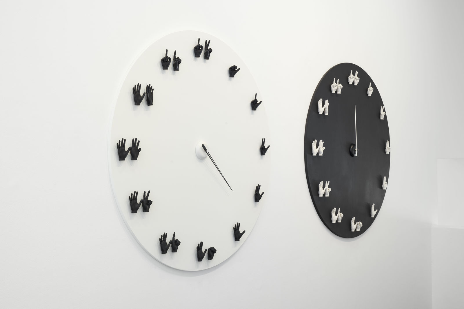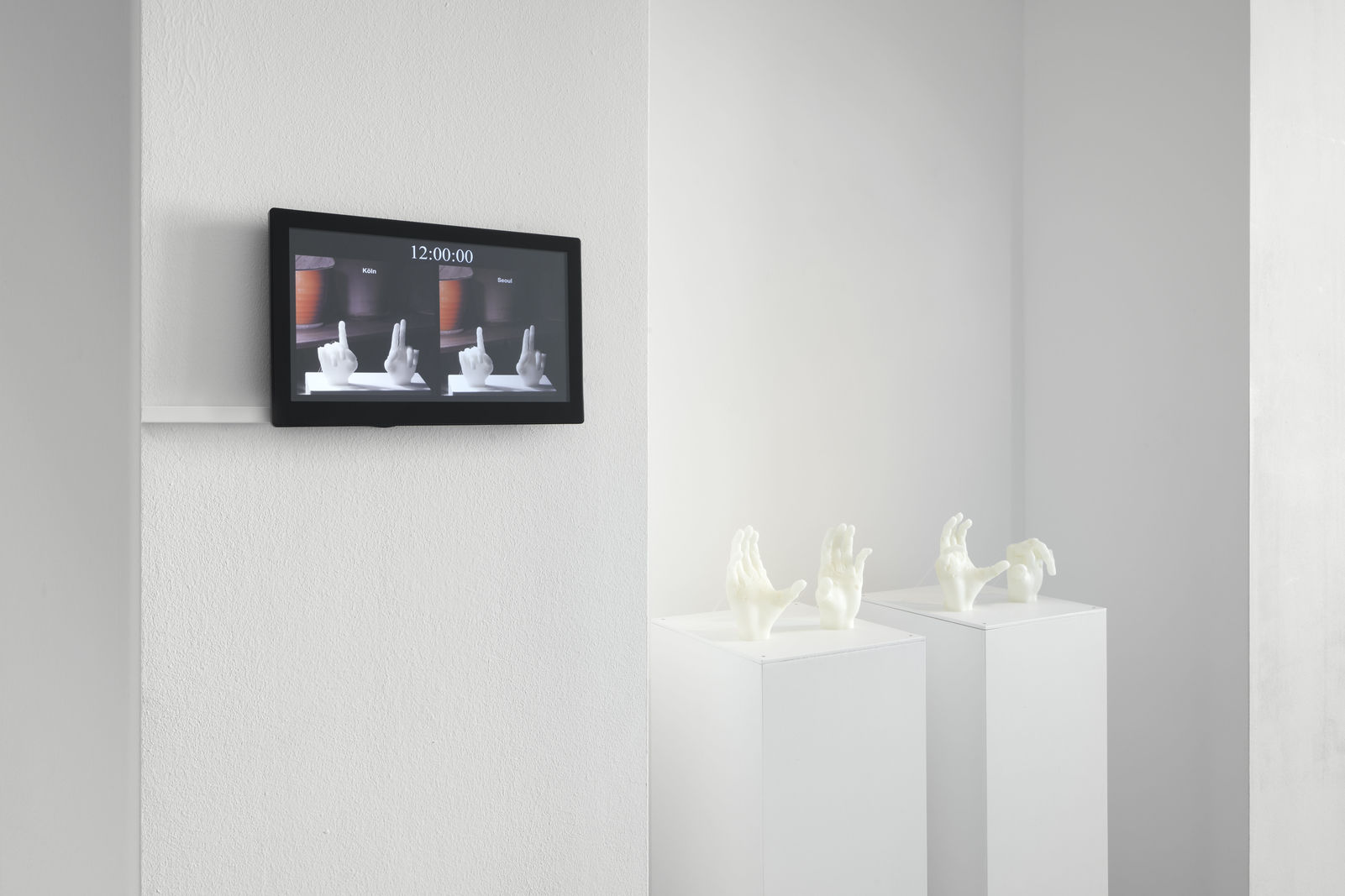 Gewohnheiten beim Zählen mit den Fingern sind. Indem die Installation die Ortszeiten von Seoul und Berlin