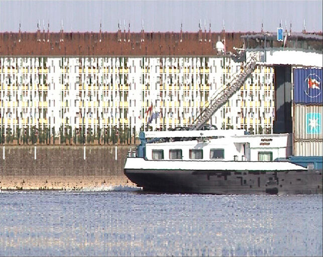 Das Ausgangsmaterial zeigt einen Cargofrachter, der sich vor dem Hintergrund einer Wohnblocksiedlung langsam den Rhein hinaufbewegt. Das Videobild ist in 180 vertikale Fragmente zerschnitten und in neuer räumlicher Anordnung wieder zusammengefügt. Der figurative Bildeindruck ist atomisiert. Mit dem Auftauchen des Containerschiffes, beginnt sich die zeitliche Struktur des zersplitterten Bildfeldes zu verändern.