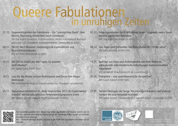 Die zentrale GeStiK-Ringvorlesung der Uni Köln wird in diesem Semester gemeinsam mit der Kunsthochschule für Medien (KHM) veranstaltet. Es werden Beiträge mit Schnittstellen an Wissenschaft, Kunst und Aktivismus versammelt, vor- und zur Diskussion gestellt. Es geht um ein Fabulieren über queer-feministische und dekoloniale Strategien, für ein Anderswerden von Welt, darum, „andere“ Geschichten zu erzählen und Visionen zu entwickeln, in einer eher desillusionierenden Gegenwart. Wir möchten dazu einladen, über Möglichkeiten von veränderten Praktiken des In-der-Welt-Seins, von Ent/Essentialiserungen und De-Zentralisierungen nachzudenken und / oder experimentell zu 'arbeiten'. Alle Interessierten sind herzlich willkommen!