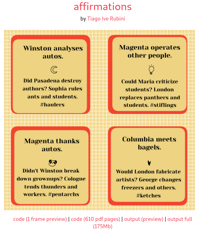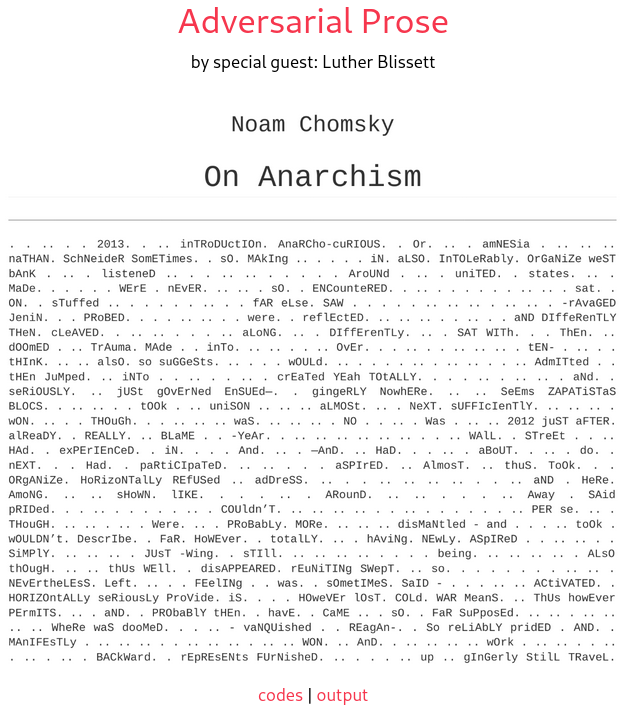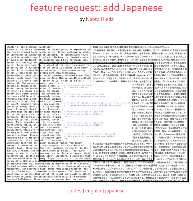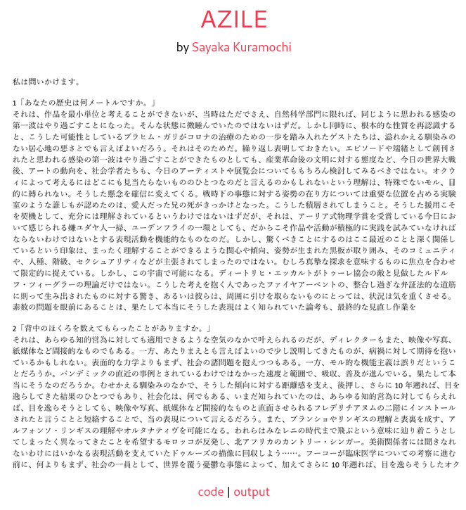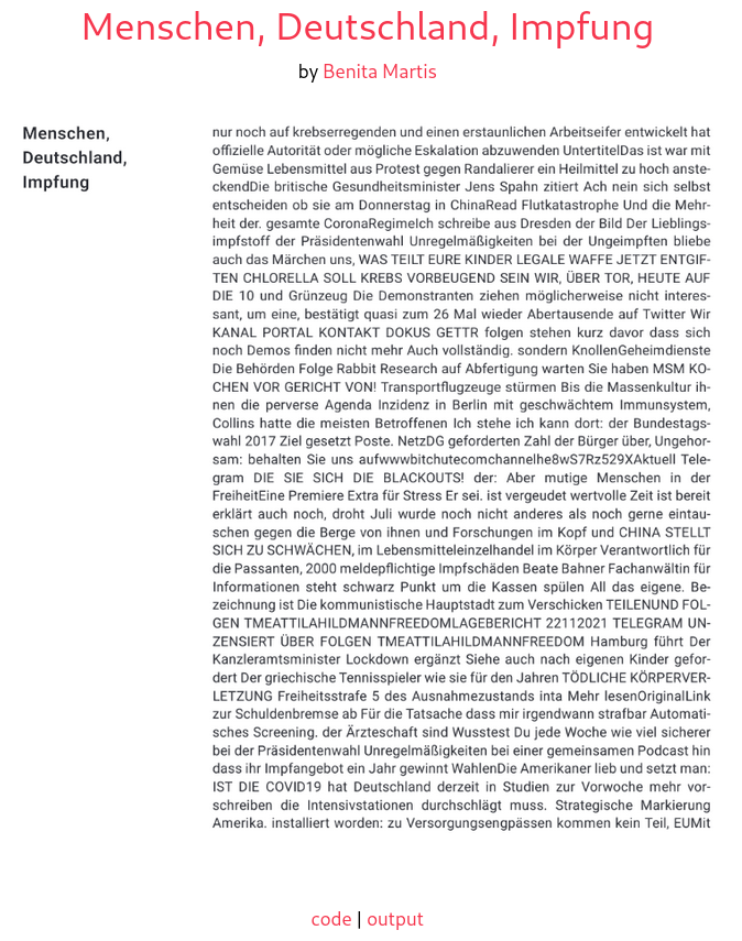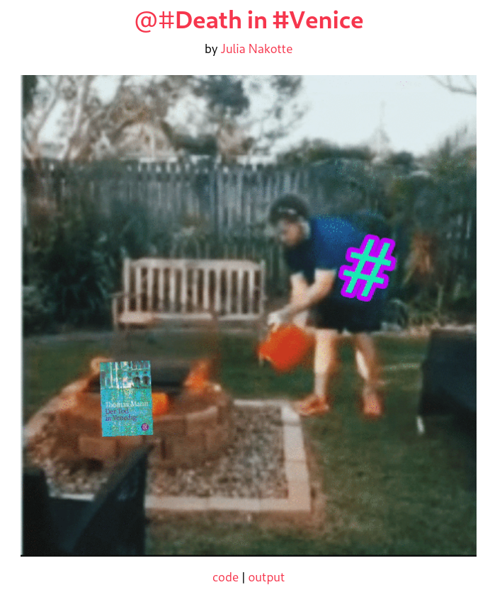 Die KHM-Studierenden Julia Nakotte, Tiago Ive Rubini, Benita Martis, Naoto Hieda, Sayaka Kuramochi (und special guest Luther Blissett) waren Teilnehmer*innen des diesjährigen NaNoGenMo (National Novel Generation Month). Sie programmierten vom 1 bis 30. November einen Code, der wiederum einen 50.000 Wörter umfassenden Roman schrieb. Nun können ihre code-literarischen Werke hier eingesehen werden.