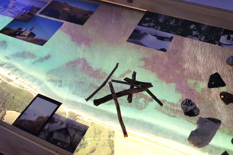 In ihrer Mixed-Media-Installation Die DDR hat’s nie gegeben (2021) setzt sich Anne Arndt mit dem Erbe der DDR auseinander am Beispiel einer Bunkeranlage an der Ostsee, die in der DDR als Grenzsicherungsanlage genutzt wurde. Die Bunker sind mittlerweile durch Stranderosion von der Küste ins Meer gewandert. In weniger als zehn Jahren werden sie komplett im Meer versunken sein. Das Verschwinden dieser Monolithen dient Anne Arndt als Metapher für den Umgang mit der Geschichte der DDR und verweist auf Konzepte wie Heimat versus Flucht, History versus Memory, Identität versus Othering.