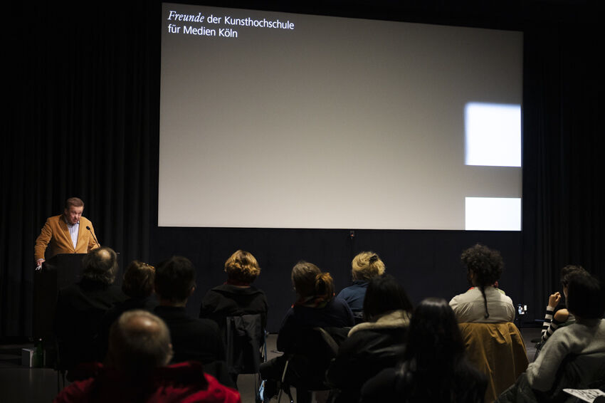 Die Eröffnung des Rundgangs "außer der Reihe" begann stimmungsvoll und erhebend: Nach der Begrüßung durch den Stellv. Rektor Mathias Antlfinger und einer Einführung in das Konzept des Großen Kunstpreises durch Christian Nagel, den Vorsitzenden des Vereins der Freunde der KHM, folgten Laudationes, Gespräche und die Preisübergabe an die beiden beglückten Künstler*innen.