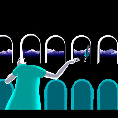 Die beiden KHM-Absolvent*innen Sae Yun Jung und EunJin Park realisierten im Rahmen einer Künstlerresidenz mit „The Girl in the Glass“ (2022, Regie: Eunjin Park, Animation: Sae Yun Jung, Hojin Lee, Eunjin Park, 3D Artist: Kijong Kim, Music: Yoonji Kim) eine ortsbezogene Animation für das Bahnhofsgebäude Gare de Lille-Flandre. Das Mapping greift das Motiv der Suche nach sich selbst auf: „One day, myself in the mirror runs away. So I enter the mirror and run after her in order to catch me. Will I ever reach her? Or me?“