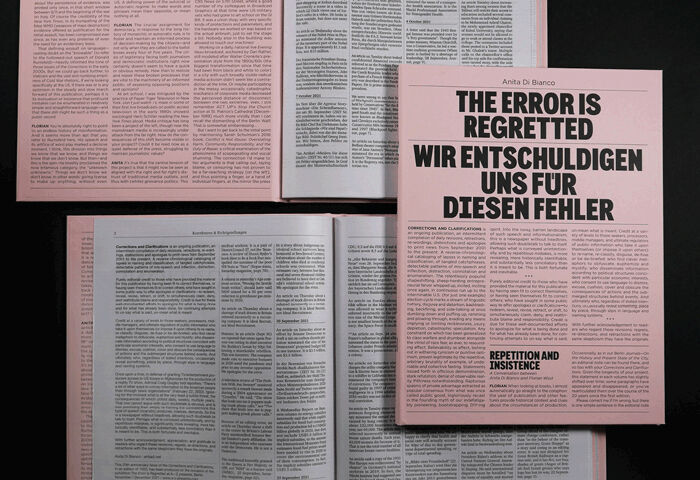 The most recent 96-page edition, released in November 2021, comprised English- and German-language news corrections from June 2020 to October 2021 – along with critical texts by Anna Bromley, Florian Wüst and Francesco Gagliardi bound into the volume entitled The Error is Regretted / Wir entschuldigen uns für diesen Fehler.