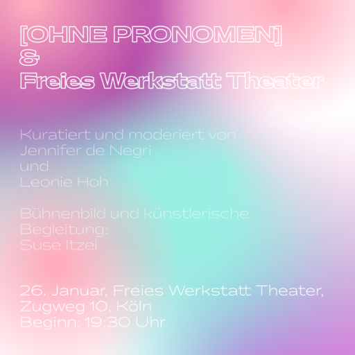 In Zusammenarbeit mit der Künstlerin Suse Itzel findet am 26. Januar die Kölner Premiere im Freiem Werkstatt Theater (FWT) statt. Es lesen Maria Babusch, Siham Karimi und Clara Werdin. Zu Gast ist außerdem Dirk Schulz, Leiter der Gender Studies der Uni Köln, für einen Talk über Labels und Literatur und für eine queer-feministische Betrachtung eines Klassikers der Schullektüre: Fontanes Effi Briest.