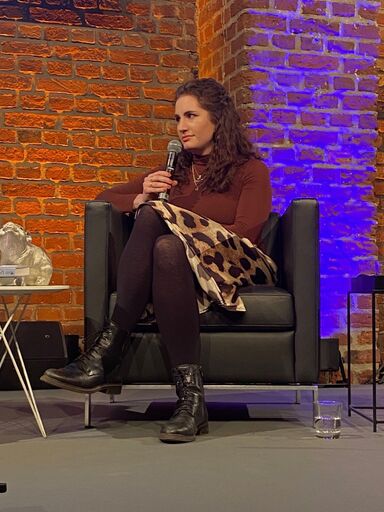 Die KHM-Studentin liest aus  ihrem ersten Roman "Keine gute Geschichte" zusammen mit den anderen Nominierten bei der Verleihung in den BALLONI-Hallen.