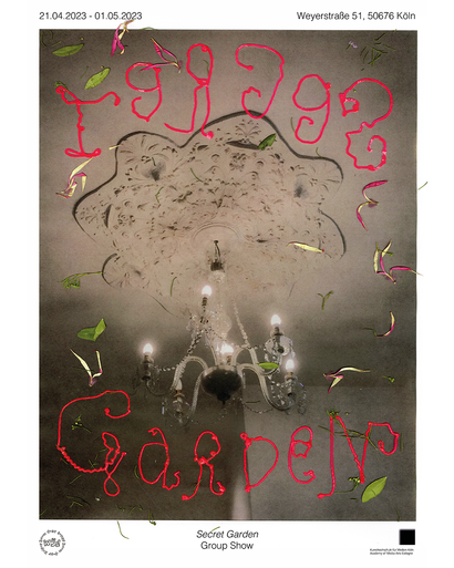 Also: Secret Garden ist eine heterogene Gruppenausstellung von über 30 Kunstschaffenden rund um das Kolloquium von Prof. Johannes Wohnseifer an der KHM. Es wird üppig werden, cozy, es wird einen Kronleuchter und Stuck geben und Pflanzliches, es wird ein vom Vermieter mit zufälligen Dekoobjekten zugestelltes Schaufenster geben (Ärgernis, aber auch: Schutz, geheimnisvoll) und einen unvermutet schönen großen Garten dahinter. Es wird um Innerliches gehen und um Verstecke, darum, das Innen vorm Außen zu schützen oder andersherum. Es wird um träumerische Vibes gehen, Gemeinschaft und Rückzugsorte, Garten-Vibes halt, und ein bisschen Darkness ist auch mit dabei. Worum es nicht so sehr gehen soll, ist der Garten Eden, der ist irgendwie blöd, besser ist das irdische Paradies. Wobei, in der Umfrage darüber, wer was zeigt, hieß es, dass es vielleicht einen Altar geben wird, also: natürlich wartet im geheimen Garten auch spirituelle Erfrischung auf alle Besuchenden. Es darf direkt aus der Quelle getrunken werden.