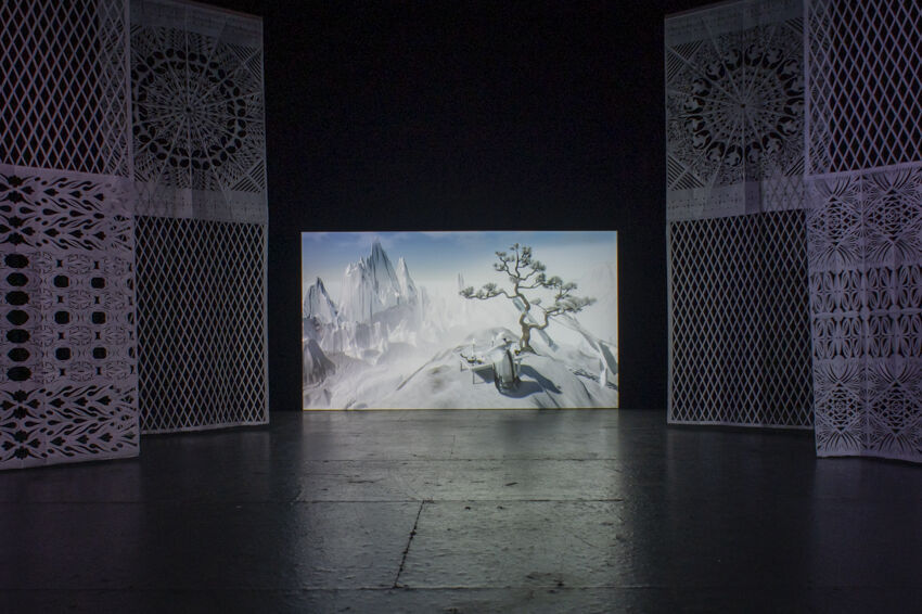 Die Schwingen eines Kranichs, schneebedeckte Bergspitzen, eine Geisterarmee: Hanna Nohs 3D-Grafikanimation über das DMZ Grenzgebiet zwischen Nord- und Südkorea hat einen stark immersiven, meditativen Charakter, dem man sich nur schwer entziehen kann. Der symbolbehaftete Rotkronenkranich, auf dessen Flügeln wir durch das Gebirge getragen werden, wird in einem schamanischen Tanzritual zu einem metaphorischen Sinnbild des Friedens. Die schemenhaften Figuren in dem in blassen Weiß- und Grautönen gehaltenen Bildern geben dem Video etwas geisterhaftes, so als ob sich die Künstlerin einer realistischen Darstellung der DMZ bewußt entziehen möchte. Tatsächlich wirft der poetisch-theoretische Text dieses Videos Fragen über die Darstellbarkeit dieser Region auf und entlässt die Besucher*innen mit der Erkenntnis, dass ein Zeichensystem auch immer ein spiritueller Akt ist. Damit öffnet Hanna Noh eine Herangehensweise an Kunst, die hierzulande zwar nicht verloren, aber doch eher selten in der westlichen Welt ist.