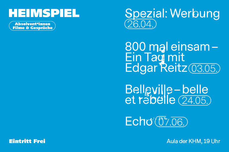 Mit der öffentlichen Filmreihe „HEIMSPIEL“ lädt die Kunsthochschule für Medien Köln seit 2003 regelmäßig ihre Absolvent*innen wieder an die Hochschule ein, um ihre ersten langen Filme nach dem Studium an der KHM zu präsentieren. Jeweils nach der Filmvorführung finden ausführliche Publikumsgespräche über die Entstehung und die Rezeption der Filme statt, die (soweit möglich) von Professor*innen moderiert werden, die die Absolvent*innen im Studium an der KHM begleitet haben.