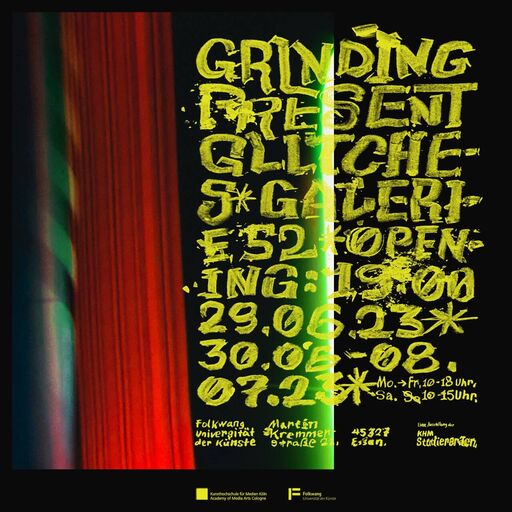 Studierende der Kunsthochschule für Medien Köln beschäftigen sich in der Ausstellung GRINDING PRESENT GLITCHES mit den Verwerfungen der Gegenwart und mit Entwürfen zu einer umfassenden Transformation. Multiple, miteinander verbundene Krisen dringen in immer kürzeren Abständen in unseren Alltag ein. Debatten um Diskriminierung sind deutliche Anzeichen, dass bestehende Machtverhältnisse nicht mehr akzeptiert werden: Die Arbeit an der eigenen Identität und der Widerstand gegen ein kategorisierendes Einteilen von Menschen ist künstlerische und politische Arbeit zugleich.