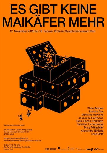 The title of our exhibition Es gibt kein Maikäfer mehr borrows from a popular Schlager song from 1974 by folk singer Reinhard Mey. In the song, Mey nostalgically observes the newly constructed car park that has replaced the home of an old acquaintance. This nostalgia recalls a time predating urbanisation, when local communities gathered together to chase Maikäfer insects, which threatened crops and forests. In our collective as well as individual works, we respond to this song lyric by reflecting on how processes of modernisation and industrialisation have fallen short of their „Wirtschaftswunder“ promises of prosperity and how utopian projects have fallen out time, both in the specific context of Marl and within broader historical and geographical contexts.