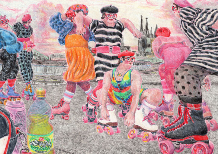 Den anderen Teil der Ausstellung bilden Farbarbeiten, detailreiche Werke, angelegt mit Polychromos-Buntstiften. Sie haben etwas Wimmelbild-artiges, zumindest wurde das so schon häufiger von Betrachtenden gesagt. Die Arbeiten sind bunt und kleinteilig, und sie zeigen Landschaften und Orte, denen Tobias Schulenburg auf seinen Spaziergängen begegnet ist: ein Fußgängeraufgang an einer Bundesstraßen-Brücke, ein grasbewachsener Lärmschutzhügel, ein Regenwasserbecker der Stadtwerke, durch einen Maschendrahtzaun gesehen. In diesen Szenerien agieren zumeist Fantasiefiguren: ein Hundedrache und die dazugehörige Zähmerin, fellbedeckte Schmetterlinge, aktive Senior*innen (kleiner Scherz), ein Rudel Schuhe. Ab und zu erscheint auch der Künstler selber, sanfter und schöner gekleidet, als er das bisher sonst in der Öffentlichkeit ist, zu sein wagt. Am Ende geht es in den Arbeiten um die Suche nach einer als schön empfundenen Zeit. Hier ist sie.