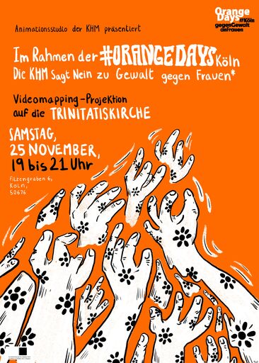 Seit 2019 engagiert sich die KHM aktiv bei den Kampagnen "Orange The World" und "Orange Days Köln" zur Sensibilisierung und Bekämpfung geschlechtsspezifischer Gewalt. Im Jahr 2019 haben wir ein Videomapping an der Trinitatiskirche durchgeführt, um den Schwestern Mirabal und ihrem Widerstand gegen den Diktator Trujillo zu gedenken. Aufgrund der Pandemie haben wir im Jahr 2020 auf Augmented Reality (AR) und Animation umgestellt, um weiterhin teilnehmen zu können. Im Jahr 2021 haben wir unsere Zusammenarbeit mit Universitäten in Mexiko und Kolumbien erweitert und im Jahr 2022 lag unser Fokus auf der Situation der Frauen im Iran, was durch künstlerische Interventionen verdeutlicht wurde.