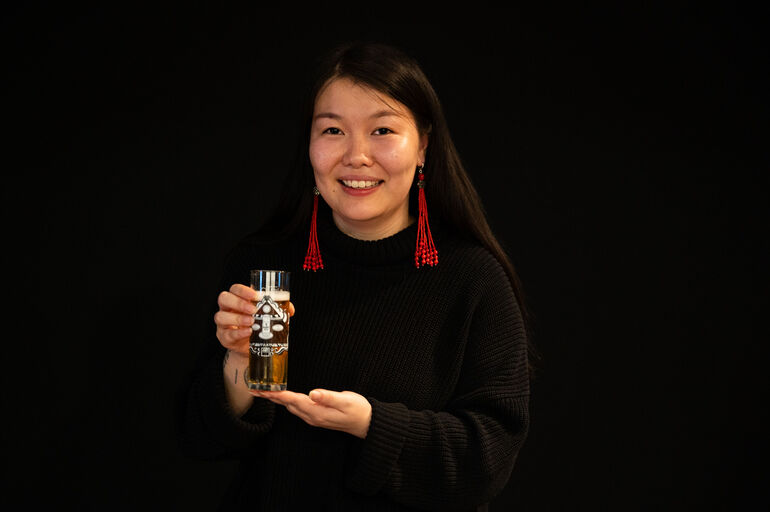 Shuree Sarantuya mit ihrem Gaffal Kölsch-Glas (Foto: Baxberg/KHM 2023)