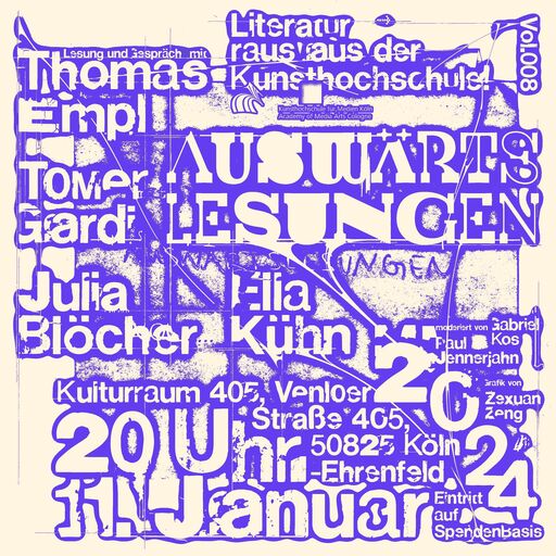 Von Paul Jennerjahn und Julie Sophia Schöttner initiiert, kuratiert und moderiert, begrüßen die Auswärtslesungen zum Wintersemester 2023/24 auch Gabriel Kos, Yohan Holtkamp und Lisa James im Team.