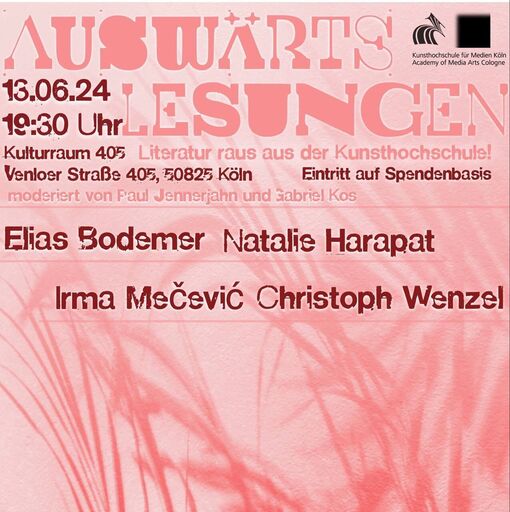 Auswärtslesungen – das ist eine Lesereihe von KHM-Studierenden des Literarischen Schreibens. Wir möchten aus der Institution Kunsthochschule heraustreten und rein in die Stadt, eine gemeinsame Bühne schaffen und Austausch finden, Texte miteinander teilen, lesen, zuhören, diskutieren. Zu jeder Veranstaltung laden die Auswärtslesungen drei Studierende der KHM sowie eine*n weitere*n Autor*in aus dem Raum Köln zu Lesung und Gespräch ein.