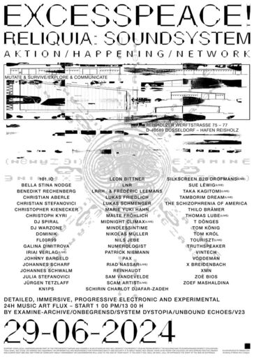 Am 29. Juni bringt „excesspeace! reliquia: soundsystem“ fünf Dutzend internationale Bild- und Klangkünstlerinnen in einer Mixed Media-Aktion im Düsseldorf Hafen ev. zusammen. „excesspeace! reliquia: soundsystem“ fungiert als Labor, Ort der Begegnung, Entwicklung und Darstellung, um neue kulturelle Botschaften zu demonstrieren. Ein freies Gegenkonzept zu konsumorientierten, idealisierten Lebensstilen und gesellschaftlichem Konsens.