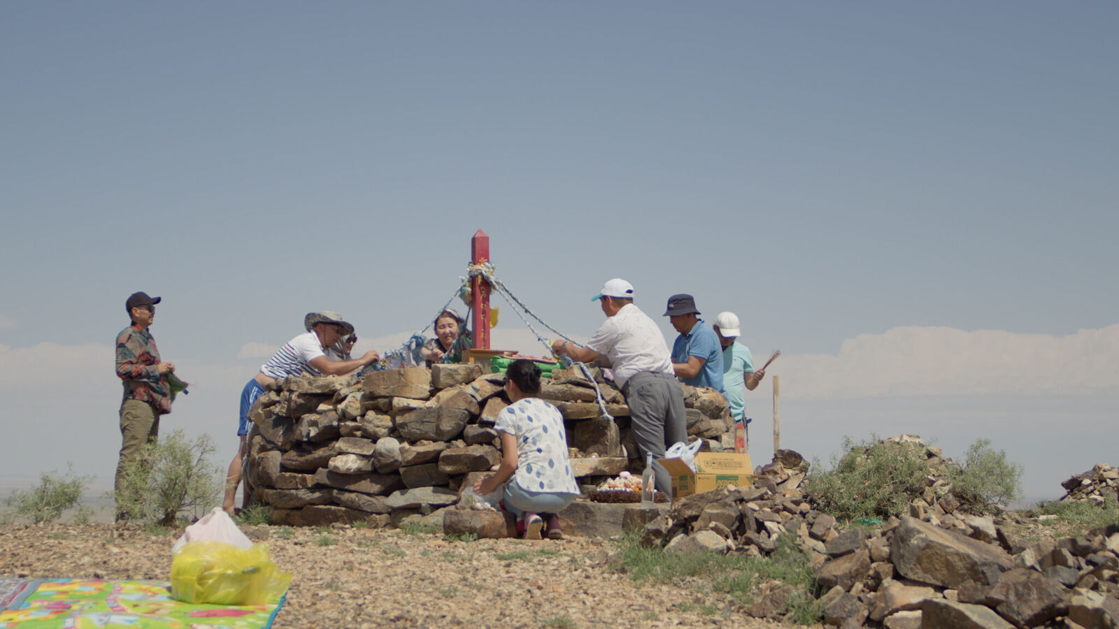 In ihrer Dreikanal-Videoinstallation "Ovoo" (2024) befasst sich Javkhlan Ariunbold mit dem grundlegenden menschlichen Glauben an die Natur und erforscht Rituale, die bis heute in der Heimat der Künstlerin, der Mongolei, von Nomad*innen praktiziert werden. Im Zentrum stehen die wechselseitigen Abhängigkeiten zwischen Tier- und Pflanzenwelt und der Glaube, dass jeder Ort, jeder Berg und jeder Fluss von Schutzgöttern bewohnt wird.
