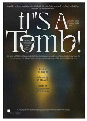 Der Titel „It’s a Tomb!“ entstand nach einer intensiven Auseinandersetzung der Studierenden mit dem Gebäude, insbesondere mit dem Raum des Geschäftsführers. Der seit 2008 geschlossene und verwaiste Raum wirkte auf sie wie eine Gruft, in der alles Leben und alle Bewegungen erstarrt sind. Neben den Arbeiten, die als Reaktionen auf die Pyramide entstanden sind, gibt es in der Ausstellung keine verbindende Thematik. Die Studierenden folgen ihren eigenen künstlerischen Schwerpunkten und passen diese an die architektonischen Gegebenheiten an. Eine interaktive Soundinstallation, in der folkloristische Erzählungen, Aberglauben und Mythen rund um die Milch kulturhistorisch aufbereitet werden oder ein stets wachsenden Work-in-Progress zur Faszination für Pilze und deren Bedeutung für das Ökosystem, können entdeckt werden. Eine 2-Kanal-Videoinstallation beschäftigt sich quasi forensisch mit der Mack-Pyramide und blickt auf Details des Hauses und verwebt in ihrer Narration Fiktion und Fakten.