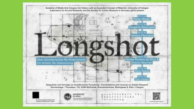 Longshot – Gespräche und Vorträge zur künstlerischen Forschung – präsentiert von der Kunsthochschule für Medien (Kunstgeschichte mit erweitertem Materialbegriff), Universität zu Köln (Labor für Kunst & Forschung) und Gesellschaft für Künstlerische Forschung in Deutschland (gfkd).