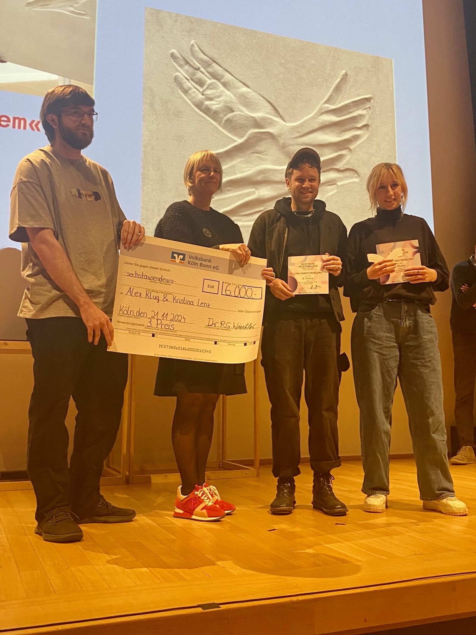 Der 3. und mit 6.000 Euro dotierte Design Preis erhielten Kristina Lenz und Alex Simon Klug für ihre Arbeit "The Hands Problem", der Sonderpreis von KölnBusiness mit ebenfalls 6.000 Euro ging an Rike Hopsse und ihre "Künstler*innenkabine". Die Preisträger*innen haben gerade ihr Diplomstudium an der KHM abgeschlossen.