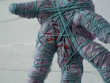 visualisieren. Große Puppen, kleine Möbel, brüchige Haut aus Fäden - eine sonderbare Familie im Schaufenster erforscht ihre Verbindungen. @schicht.dessert