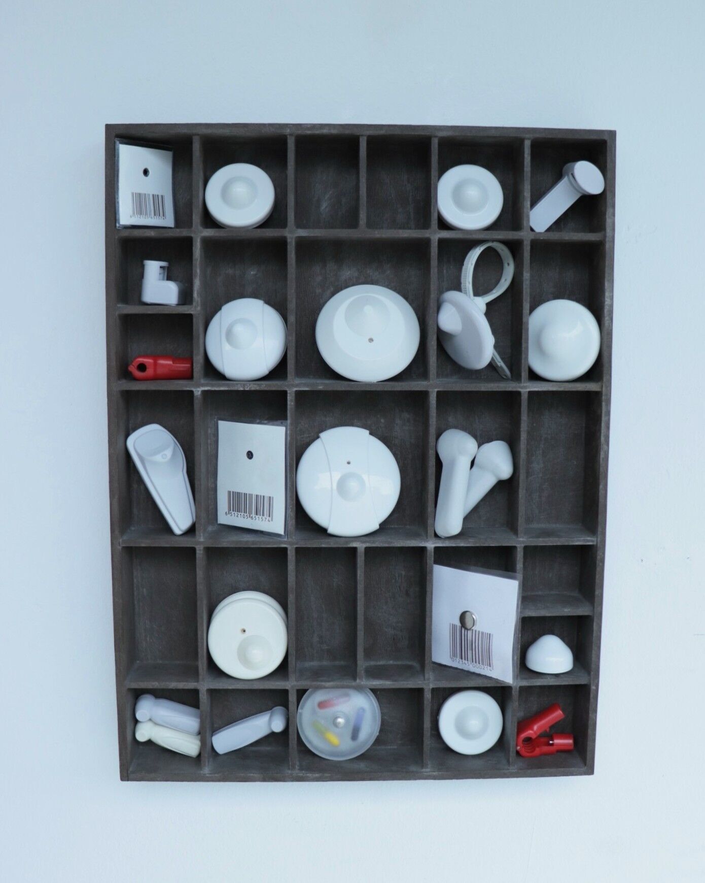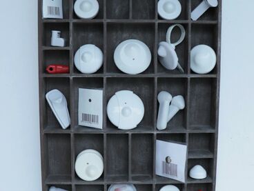 Setzkasten aus Holz, diverse Hartetiketten zur Warensicherung / Styropor, PU-Schaum, Zeitung, Acrylfarbe, Druckluftschlauch, Gummi