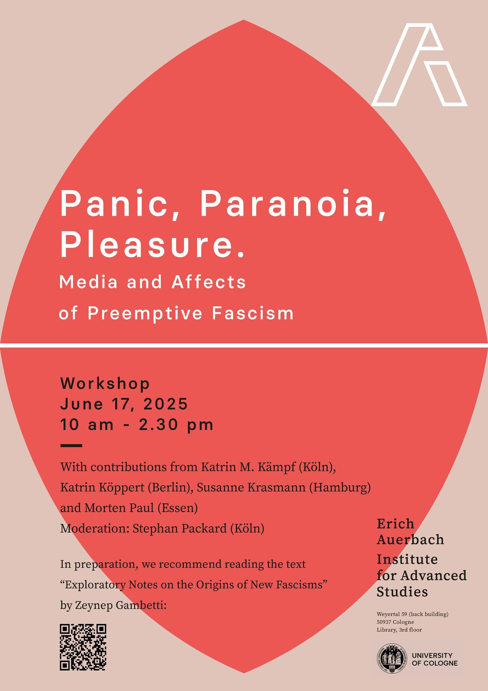 Im Anschluss an den Vortrag vonKatrin Köppert beschäftigen wir uns in diesem Workshop mit dem Verhältnis von Affekt und Medien im Zuge des global zunehmenden Faschismus und Autoritarismus. Diese Entwicklung diskutieren wir unter dem Schlagwort des pre-emptiven Faschismus, das heißt eines Faschismus, der in algorithmische Logiken der Prädiktion eingebettet, potentielle Bedrohungen und fiktive Ängste vorbeugend und mit Lustgewinn reguliert. Wie also greifen Panik, Paranoia und Begehren ineinander? Und welche Rolle spielen dabei digitale Medien bzw. algorithmische Logiken?
