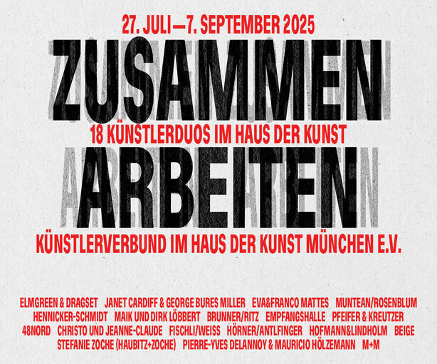 Die 7. Biennale im Haus der Kunst in München widmet sich dieses Jahr ausschließlich Künstlerpaaren. zusammen arbeiten ist der Titel der Show, die vom 26. Juli bis 7. September 2025 im Westflügel des Haus der Kunst stattfindet. Nationale und internationale Kunstschaffende, die als Duo erfolgreich kreativ zusammenarbeiten oder gearbeitet haben, stellen im Ausstellungsprojekt des Künstlerverbund im Haus der Kunst München e.V. ihre Werke aus.