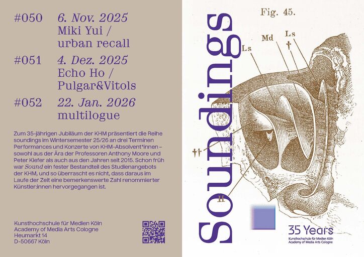 Als Beitrag zum 35-jährigem Jubiläum der KHM lädt die Reihe soundings im Wintersemester 25/26 Absolvent*innen aus der Zeit der Professoren Anthony Moore und Peter Kiefer und aus der Zeit seit 2015 ein. Sound war sehr früh ein Teil des Studienangebotes der KHM. So verwundert es nicht, dass daraus inzwischen eine ganze Reihe renommierter Künstler*innen hervorgegangen sind.