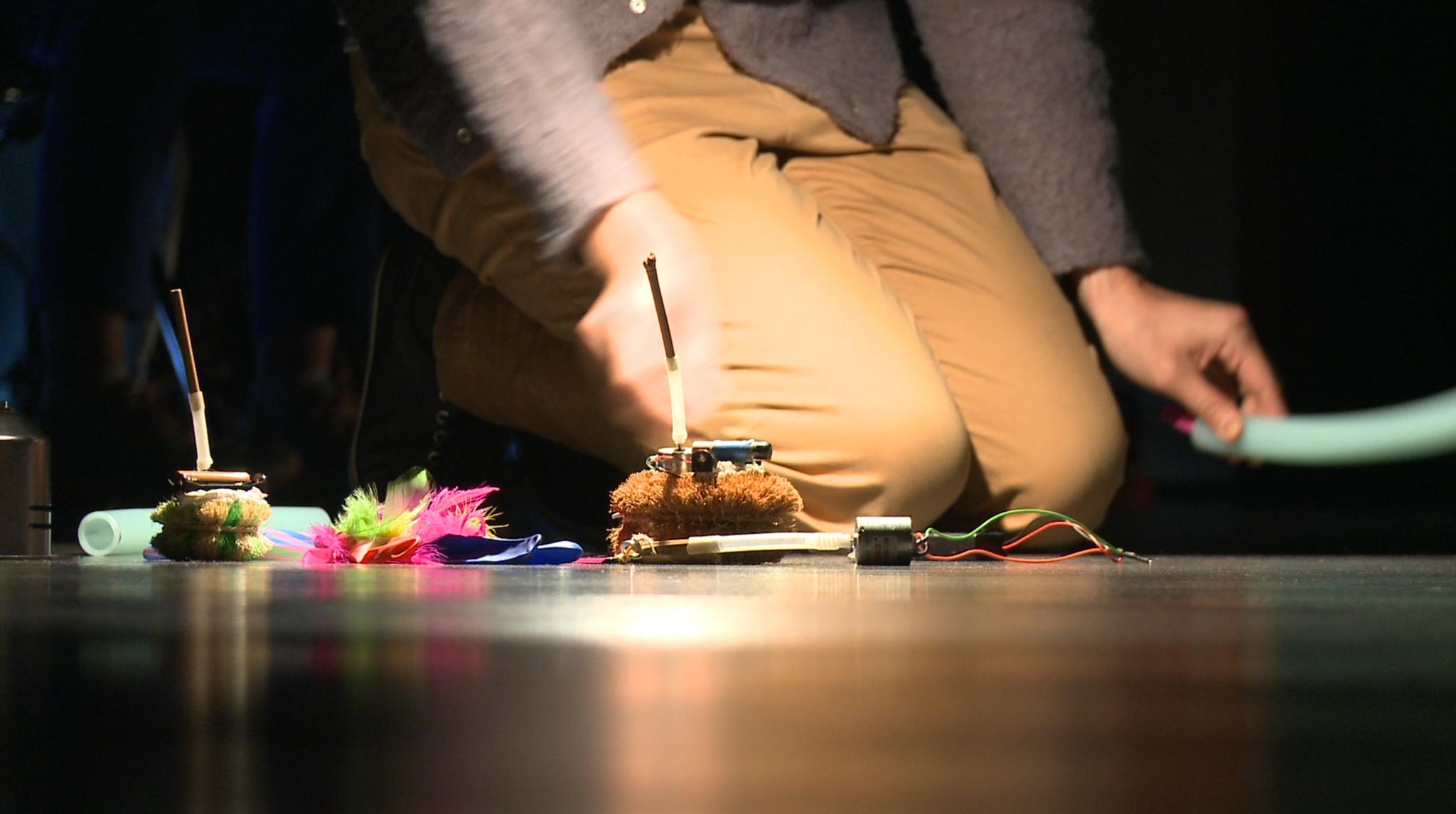 Rie Nakajimas Arbeit entsteht aus der Beobachtung physikalischer Gegebenheiten im Kontext von Räumen und Orten und durch den Gebrauch von Klang und visuellen Elementen. Als Material benutzt sie dabei gefundene Objekte, Spielzeuginstrumente, kinetische Gebilde und Audiogerätschaften. Ihre Performances bestehen aus der wohlüberlegten Aktivierung und Platzierung von vielen solcher Objekten im Raum, deren nach und nach sich überlagernde, humpelnde Patterns sich wie Worte zu Sätzen zusammenschließen, die sich ständig verändern und wieder zerfallen.