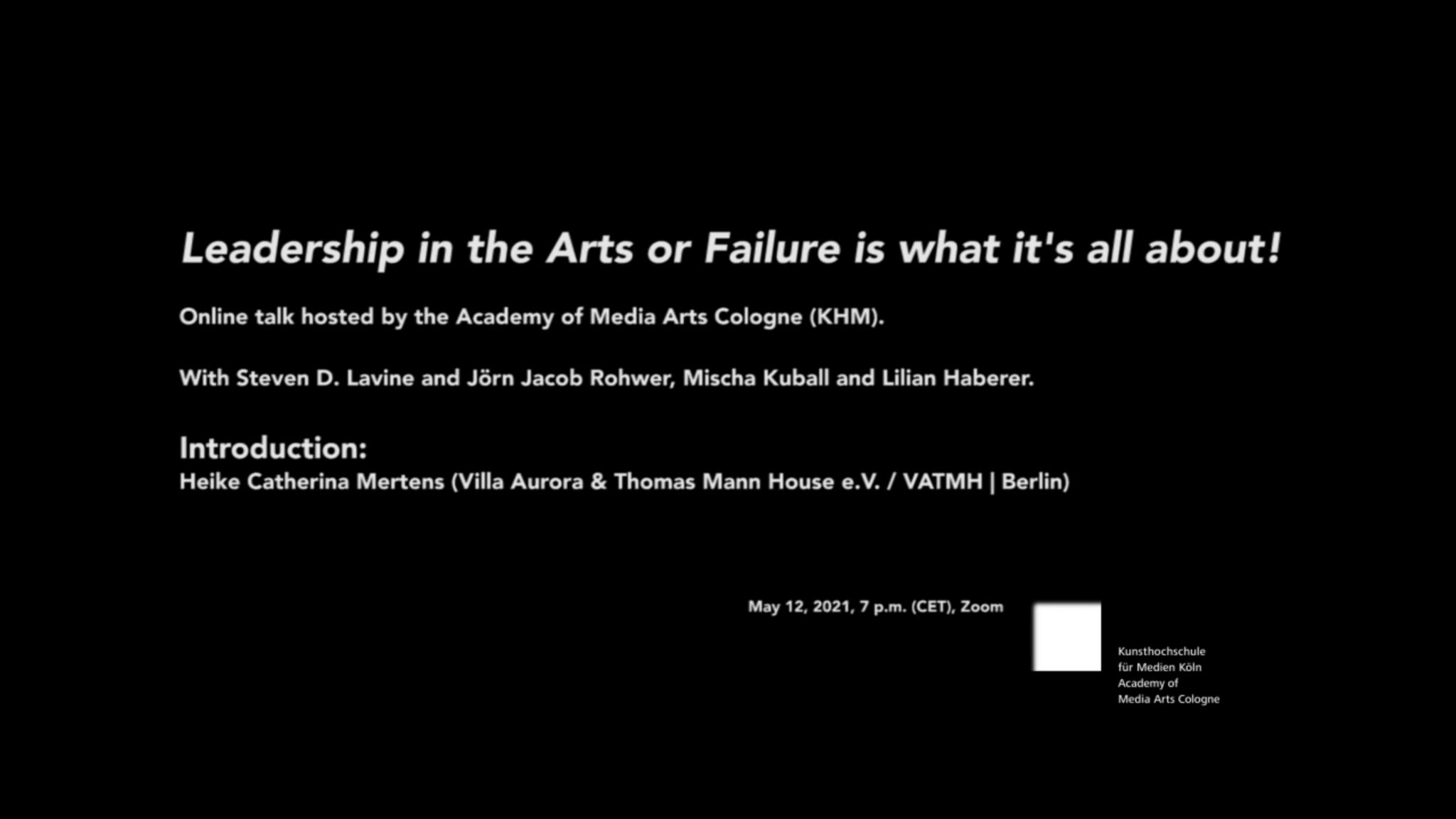 Why is failure a possible and important principle in artistic practice and its teachings? Our guests Steven D. Lavine and Jörn Jacob Rohwer address this question in conversation with Mischa Kuball and Lilian Haberer. Based on Lavine's experience as long-term president of the California Institute of the Arts (CalArts 1988-2017), our guests connects the teachings of American (private) art schools with those in Germany. CalArts lived through a long period of insignificance before Steven D. Lavine stepped in and led it to financial prosperity and international renown. Today, the art school is a cradle for Oscar and Pulitzer Prize winners, for Mellon and Guggenheim Fellows: a hotspot of U.S. creativity. The conversation is prompted by the just-published biography of former CalArts president Steven D. Lavine, written by Villa Aurora alumnus Jörn Jacon Rohwer: Jörn Jacob Rohwer / Steven D. Lavine. Failure is What It's All About. A Life Devoted to Leadership in the Arts. Deutscher Kunstverlag, 2021. ISBN: 978-3-422-98155-3. In this book Lavine tells his personal story for the first time. He talks about cultural politics, philanthropy, the avant-garde, and his life in Los Angeles. Prompted by self-doubt and a desire to fail, he emerges as a subtle thinker, visionary, and transatlantic mediator between the worlds of art, education, and politics. Jörn Jacob Rohwer is well known for biographical conversations with personalities from art, literature, science, and society - among others with Susan Sontag, Tomi Ungerer, Heinrich Hannover, Hans Keilson, Doris Lessing, George Tabori but also Leni Riefenstahl and Daniel Goldhagen or Richard Sennett. In 2004 Rohwer was a resident at the Villa Aurora. Online talk hosted by the Academy of Media Arts Cologne (KHM).