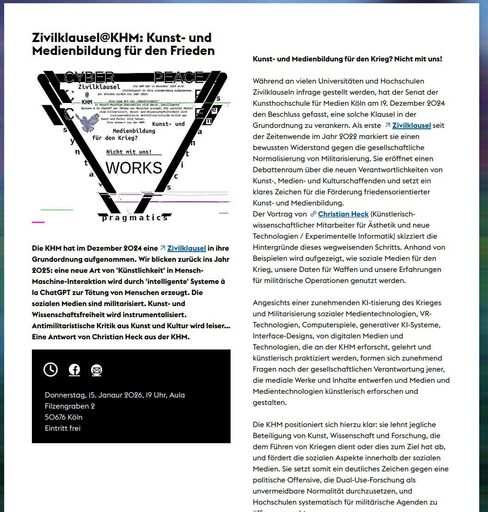 Die KHM hat im Dezember 2024 eine Zivilklausel in ihre Grundordnung aufgenommen. Wir blicken zurück ins Jahr 2025: eine neue Art von 'Künstlichkeit' in Mensch-Maschine-Interaktion wird durch 'intelligente' Systeme à la ChatGPT zur Tötung von Menschen erzeugt. Die sozialen Medien sind militarisiert. Kunst- und Wissenschaftsfreiheit wird instrumentalisiert. Antimilitaristische Kritik aus Kunst und Kultur wird leiser… Eine Antwort von Christian Heck aus der KHM.